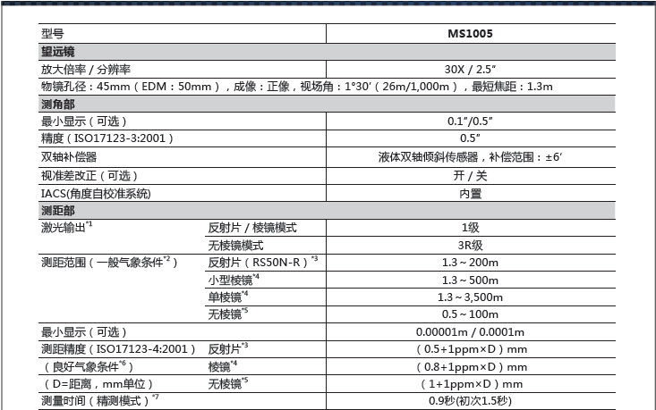 IACS 測角技術(shù)、RED-tech EX 測距技術(shù),并且具備兩大特點(diǎn):高精度、高性價比。高精度無疑是代表著MS 系列全站儀突出的優(yōu)點(diǎn)所在,0.5″的測角精度以及